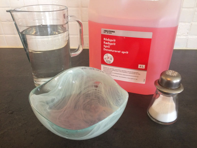 Rödsprit innehåller vanligtvis 60–100 % etanol (C2H5OH). Det innehåller även andra brännbara organiska ämnen, såsom propan, butanon eller aceton. Exakt vilken blandning din rödsprit har beror på märke. När du för en tändare eller tändsticka mot rödsprit värms vätskan upp så pass att den först förångas och sedan börjar brinna. Vad som sker då är att etanolen och övriga beståndsdelar hastigt reagerar med syrgas och bildar vatten och koldioxid (och små mängder andra biprodukter). Denna kemiska reaktion är exoterm, vilket innebär att energi frigörs till omgivningen. I denna kemiska reaktion frigörs energi i form av strålningsenergi (bland annat ljus) och rörelseenergi hos kringliggande partiklar (alltså ökad temperatur hos luften m.m.). Den kemiska reaktion som sker när etanol brinner är följande: C2H5OH + 4 O2 → 2 CO2 + 3 H2O + energi Eftersom energi aldrig kan skapas eller förbrukas, endast omvandlas, kan man fråga sig vad denna energi kom ifrån? Jo, när etanol- och syrgasmolekylerna en gång bildades (när det nu skedde) krävdes det energi för att omförflytta elektronerna i dessa molekyler så att de ingående atomerna skulle sitta ihop. Denna energi fanns sedan lagrad som potentiell energi i dessa molekyler - det vill säga ända till nu, när elektronerna i denna kemiska reaktion flyttades till mindre energikrävande positioner i nybildade molekyler. Eldflamman i denna undersökning består i huvudsak av etanol och syrgas som håller på att omvandlas till vatten och koldioxid. Det vi ser är den strålningsenergi i form av ljus som bildas i den processen. Det är möjligt att en del av flamman innehåller etanol och/eller syrgas som blivit så varmt att det joniserats. Det innebär att en del av elektronerna från dessa molekyler frigjort sig helt från dem. Detta tillstånd kallas plasma är det aggregationstillstånd som ämnena i solen har. Men det är oklart om den kemiska reaktionen i denna undersökning verkligen utvecklar så mycket värme att jonisering sker - och för våra ögon ser brinnande plasma och gas i stort sett likadant ut. Den stora frågan är ändå: varför brinner inte näsduken upp i denna undersökning? Svaret är vatten. Vattnet som näsduken också är indränkt i absorberar den mesta energi som frigörs i den exoterma kemiska reaktionen. Temperatur är ett mått på hur mycket partiklarna i ett ämne rör sig. I kallt vatten rör sig vattenmolekylerna lite och i varmt vatten rör de sig mycket. Men det krävs mycket energi för att värma vatten och få molekylerna att röra sig. Detta eftersom mycket av energin som tillförs vatten används till att böja och bryta de vätebindningar som håller ihop de enskilda vattenmolekylerna. Väldigt mycket energi absorberas av denna process, i stället för att få vattenmolekylerna att börja röra sig. Så vatten kan värmas och värmas, men ändå fortsätta vara ganska svalt. Man säger att vatten har hög värmekapacitet. Dock, när tillräckligt mycket energi har tillförts vatten bryts bindningarna helt mellan vattenmolekylerna. Vattenmolekylerna ”sprids för vinden” - vilket innebär att vattnet övergår från flytande form till gasform (vattenånga). Men varför blanda i salt? Jo, detta är för att se elden bättre. Etanol brinner nämligen med en tämligen osynlig låga, medan salt brinner med en tydligt gul låga.Experimentera