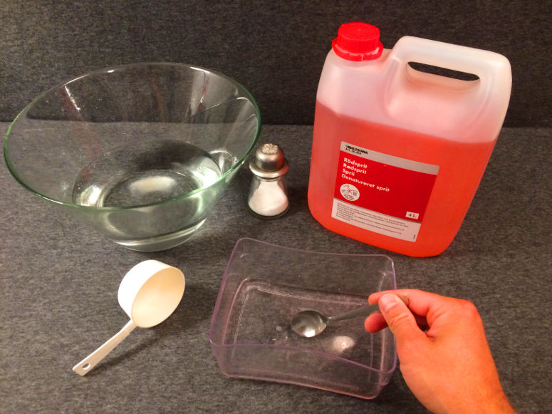Rödsprit innehåller vanligtvis 60–100 % etanol (C2H5OH). Det innehåller även andra brännbara organiska ämnen, såsom propan, butanon eller aceton. Exakt vilken blandning din rödsprit har beror på märke. När du för en tändare eller tändsticka mot rödsprit värms vätskan upp så pass att den först förångas och sedan börjar brinna. Vad som sker då är att etanolen och övriga beståndsdelar hastigt reagerar med syrgas och bildar vatten och koldioxid (och små mängder andra biprodukter). Denna kemiska reaktion är exoterm, vilket innebär att energi frigörs till omgivningen. I denna kemiska reaktion frigörs energi i form av strålningsenergi (bland annat ljus) och rörelseenergi hos kringliggande partiklar (alltså ökad temperatur hos luften m.m.). Den kemiska reaktion som sker när etanol brinner är följande: C2H5OH + 4 O2 → 2 CO2 + 3 H2O + energi Eftersom energi aldrig kan skapas eller förbrukas, endast omvandlas, kan man fråga sig vad denna energi kom ifrån? Jo, när etanol- och syrgasmolekylerna en gång bildades (när det nu skedde) krävdes det energi för att omförflytta elektronerna i dessa molekyler så att de ingående atomerna skulle sitta ihop. Denna energi fanns sedan lagrad som potentiell energi i dessa molekyler - det vill säga ända till nu, när elektronerna i denna kemiska reaktion flyttades till mindre energikrävande positioner i nybildade molekyler. Eldflamman i denna undersökning består i huvudsak av etanol och syrgas som håller på att omvandlas till vatten och koldioxid. Det vi ser är den strålningsenergi i form av ljus som bildas i den processen. Det är möjligt att en del av flamman innehåller etanol och/eller syrgas som blivit så varmt att det joniserats. Det innebär att en del av elektronerna från dessa molekyler frigjort sig helt från dem. Detta tillstånd kallas plasma är det aggregationstillstånd som ämnena i solen har. Men det är oklart om den kemiska reaktionen i denna undersökning verkligen utvecklar så mycket värme att jonisering sker - och för våra ögon ser brinnande plasma och gas i stort sett likadant ut. Den stora frågan är ändå: varför brinner inte sedeln upp i denna undersökning? Svaret är vatten. Vattnet som sedeln också är indränkt i absorberar den mesta energi som frigörs i den exoterma kemiska reaktionen. Temperatur är ett mått på hur mycket partiklarna i ett ämne rör sig. I kallt vatten rör sig vattenmolekylerna lite och i varmt vatten rör de sig mycket. Men det krävs mycket energi för att värma vatten och få molekylerna att röra sig. Detta eftersom mycket av energin som tillförs vatten används till att böja och bryta de vätebindningar som håller ihop de enskilda vattenmolekylerna. Väldigt mycket energi absorberas av denna process, i stället för att få vattenmolekylerna att börja röra sig. Så vatten kan värmas och värmas, men ändå fortsätta vara ganska svalt. Man säger att vatten har hög värmekapacitet. Dock, när tillräckligt mycket energi har tillförts vatten bryts bindningarna helt mellan vattenmolekylerna. Vattenmolekylerna ”sprids för vinden” - vilket innebär att vattnet övergår från flytande form till gasform (vattenånga). Men varför blanda i salt? Jo, detta är för att se elden bättre. Etanol brinner nämligen med en tämligen osynlig låga, medan salt brinner med en tydligt gul låga.Experimentera