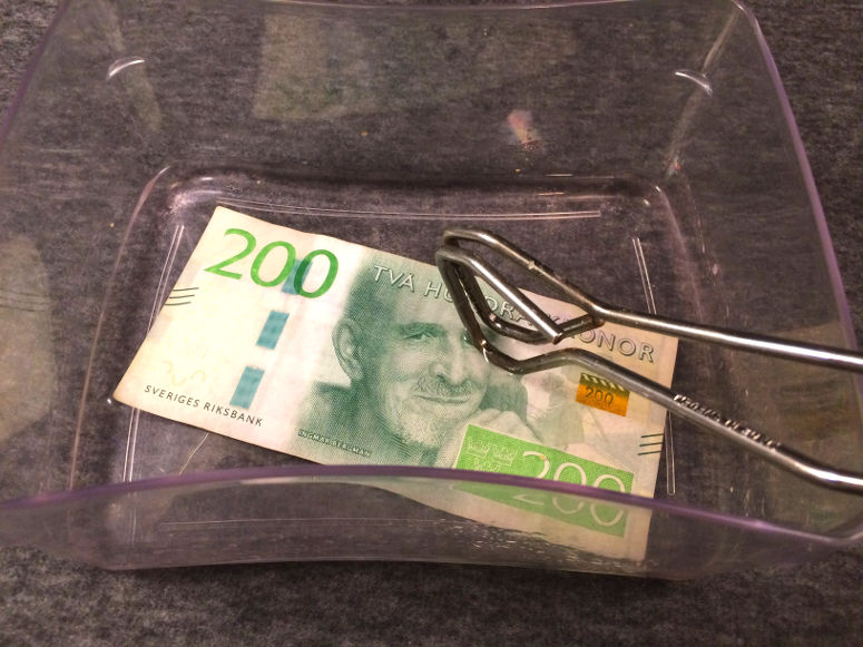 - Håll aldrig i sedeln med handen, utan använd en tång.
