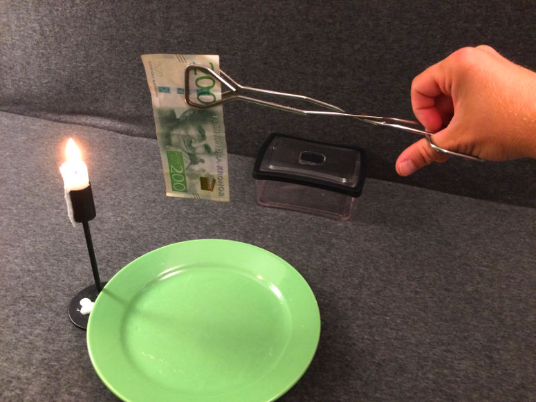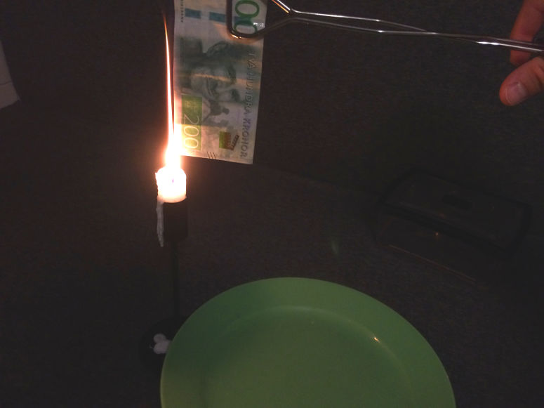 I stället för en sedel kan du använda vanligt papper eller en tygbit. En spektakulär variant av denna undersökning är att använda en hel näsduk. Den undersökningen hittar du här: Brinnande näsduken.| Gilla: | Dela: | |