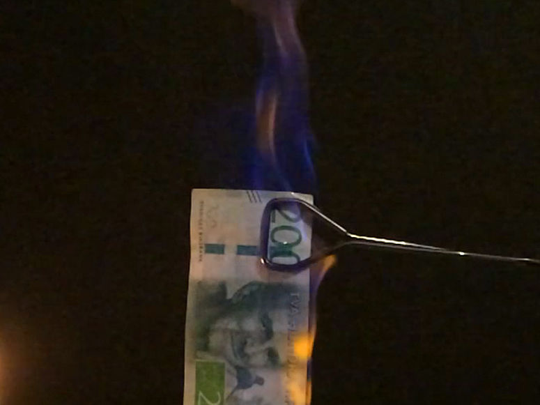 - När du ska tända eld på sedeln: Kontrollera att du inte har någon rödsprit på dig, håll sedeln långt bort från kroppen och skålen med rödsprit, samt håll den ovanför den brandsäkra tallriken.