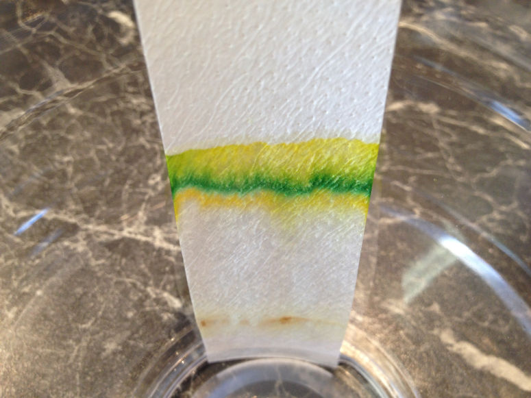 Acetonet vandrar upp längs filterpappret och tar med sig färgpigmenten från växten. Eftersom färgpigmenten rör sig olika snabbt genom filterpappret separeras de.Lång förklaring