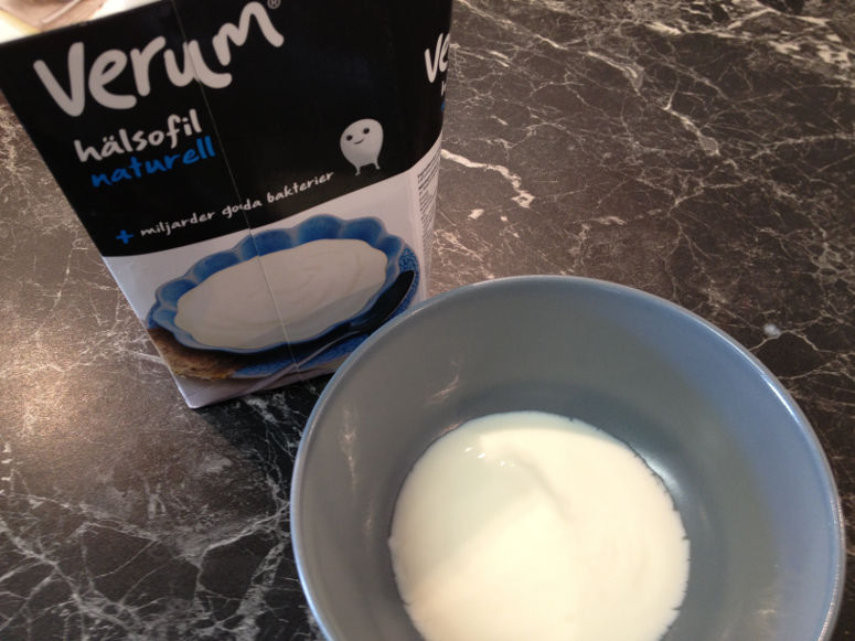 - 2 msk yoghurt med levande bakteriekultur (till exempel Verum hälsoyoghurt)