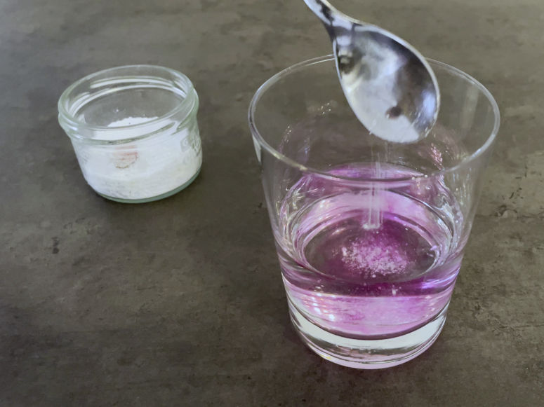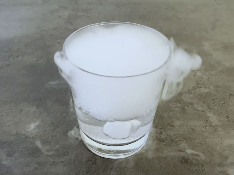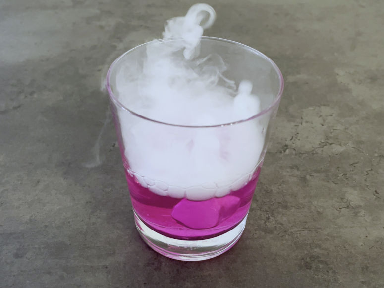 Lägg kolsyreis (torris) i ett glas med rosa vätska. Se hur det bubblar, ryker och vätskan ändrar färg! Det här experimentet handlar om aggregationstillstånd och pH-värde.