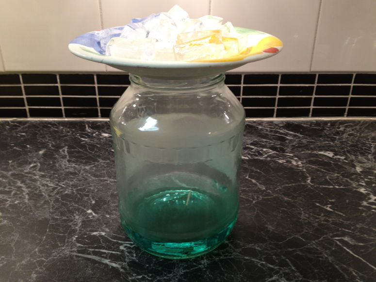 I burken avdunstar det varma vattnet och blir till vattenånga. När vattenångan sedan kyls ner av isen blir den till små droppar som syns som moln. Vattenångan kondenserar lättare på de små partiklarna som släpptes ut från det brinnande ljuset.Lång förklaring