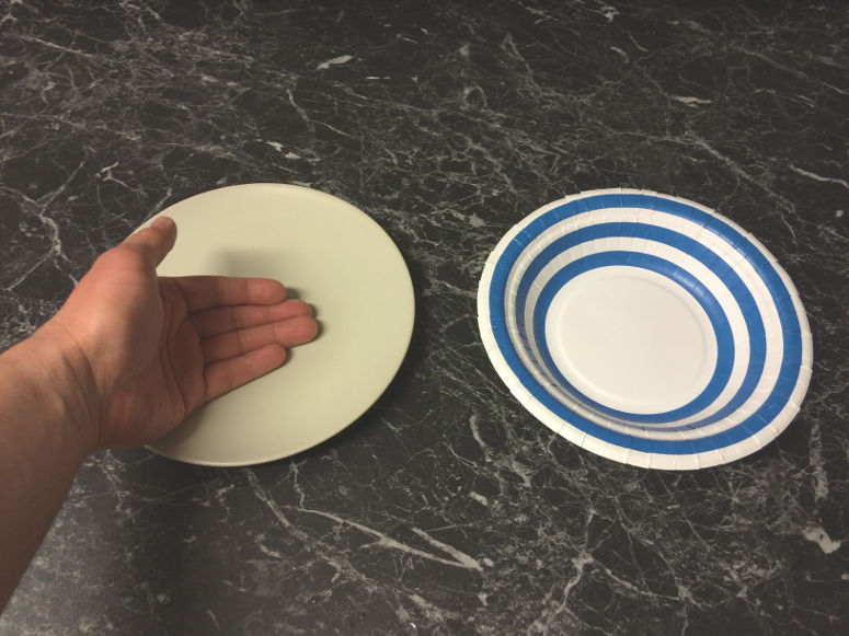 - 2 st tallrikar eller tallriksliknande föremål - En av dessa ska kännas kall och den andra varm. De ska ha ungefär samma storlek och lika mycket kontakt med bordet. Exempel är: vanlig tallrik (kall), kastrullock (kall), papptallrik (varm), lock till plastbunke (varm), frisbee (varm).