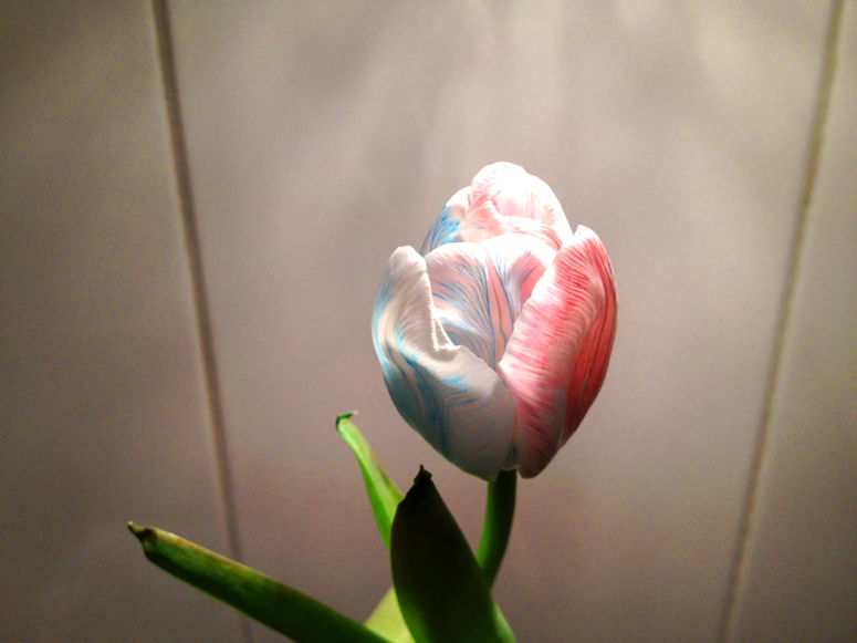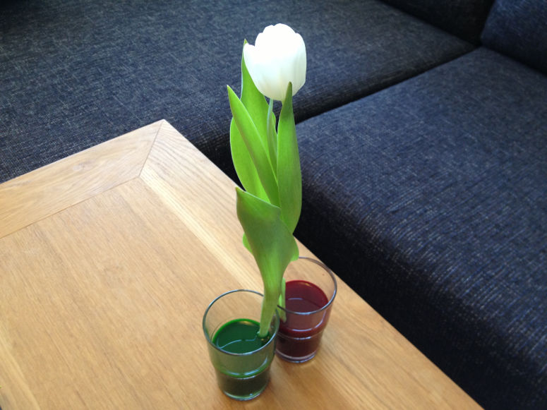 Vitsippor är också lämpliga växter för detta experiment. Deras stjälkar är dock för små för att skära i delar, men det är ändå kul att bara färga blomman i en färg. Pröva ett dela en stjälk i fyra delar och ställ varje del i varsin färg. Om du gör likadant med flera blommor får du en hel liten bukett som du kan binda ihop och som då står stadigt på sina fyra ben. Då kan du ställa hela buketten i fyra små behållare med färgat vatten, så sparar du karamellfärg också. Nu kan du verkligen få regnbågsblommor!| Gilla: | Dela: | |