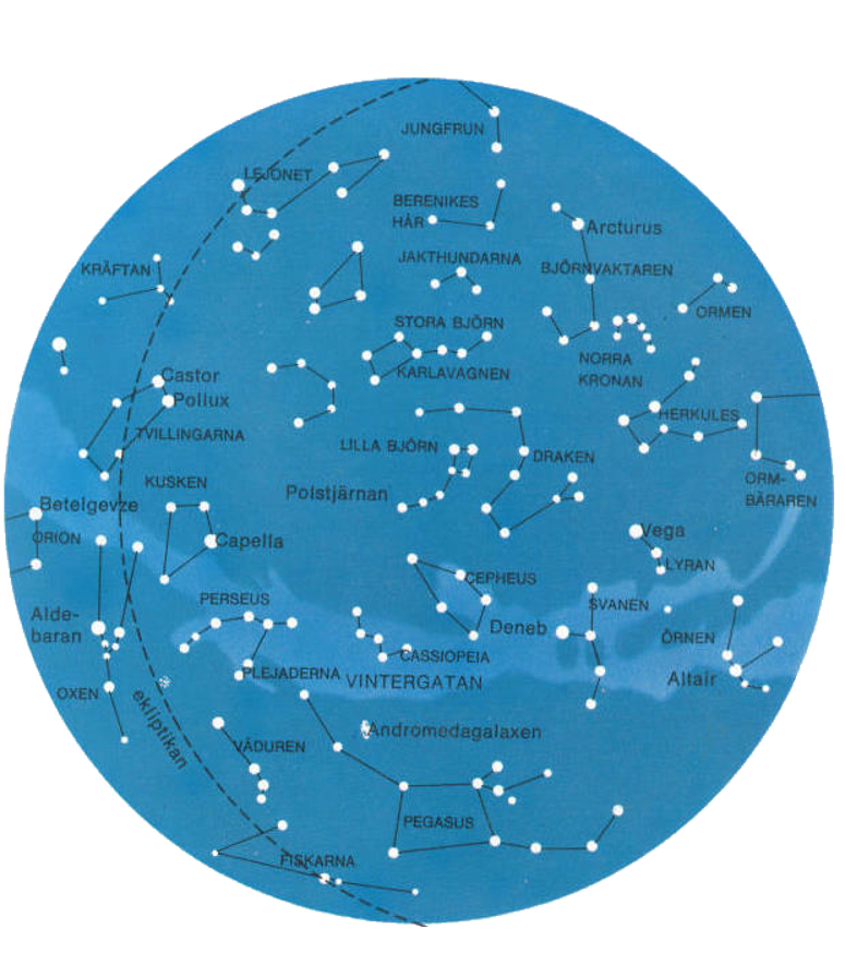 De stjärnor vi ser på natthimlen är några av de hundratals miljarder stjärnor som utgör vår galax Vintergatan. Sedan urminnes tider har människor skapat bilder av de mönster stjärnorna bildar när de ses från jorden. Dessa stjärnbilder är bra att kunna för att hitta på natthimlen. Till exempel kanske du höra om en kommande meteorsvärm som går att se i Fiskarna, eller att nu är Saturnus lätt att hitta mitt i Kusken. Bilden nedan visar natthimlen som ses från norra halvklotet under hösten och våren.